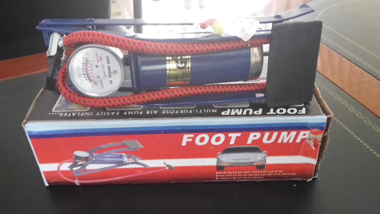 Deze trapvoetpomp voor autobanden, luchtbed en fietsbanden.